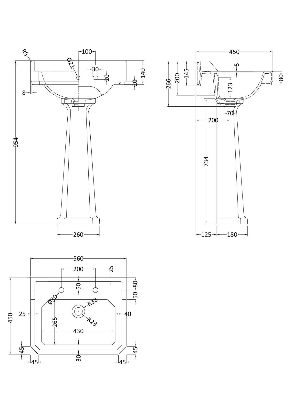 560mm 2TH Basin & Comfort Height Ped