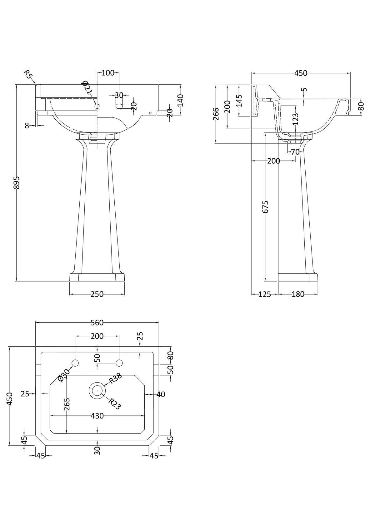 560mm Basin & Pedestal (2 Tap Hole)