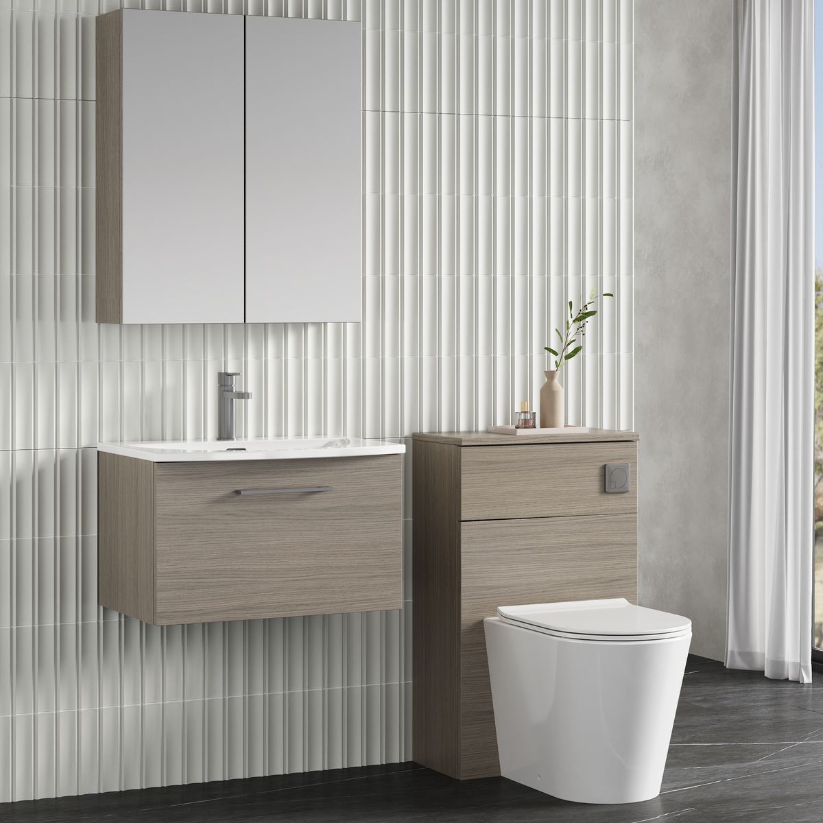 This unique solace oak finish compliments any modern bathroom and creates a designer look. This wall hung unit creates more space in your bathroom giving the illusion of a bigger bathroom. This unit has soft close doors which limits the daily wear and tear and provides a quieter closing action. Colour co-ordinate your unit with a solace oak WC unit. Supplied with high quality vitreous china basin.