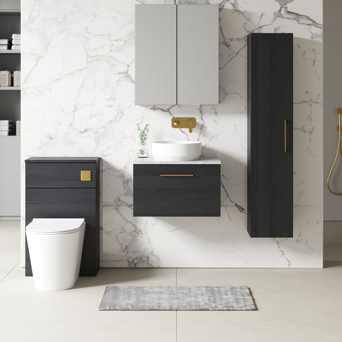 This unique charcoal black finish compliments any modern bathroom and creates a designer look. This wall hung unit creates more space in your bathroom giving the illusion of a bigger bathroom. This unit has soft close doors which limits the daily wear and tear and provides a quieter closing action. Colour co-ordinate your unit with a charcoal black WC unit. Supplied with laminate worktop, for use with vessel basins (sold separately).