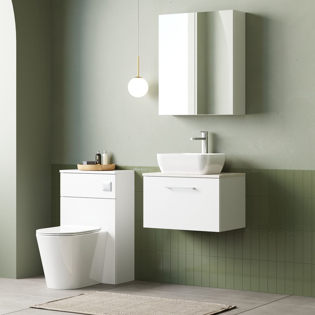 This gloss white finish compliments any modern bathroom and creates a designer look. This wall hung unit creates more space in your bathroom giving the illusion of a bigger bathroom. This unit has soft close doors which limits the daily wear and tear and provides a quieter closing action. Colour co-ordinate your unit with a gloss white WC unit. Supplied with laminate worktop, for use with vessel basins (sold separately).
