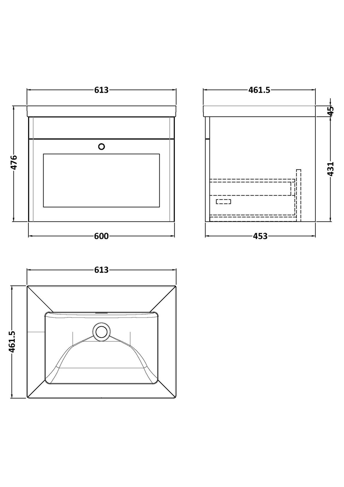 600mm Wall Hung 1-Drawer Vanity with Basin – 0 Tap Hole