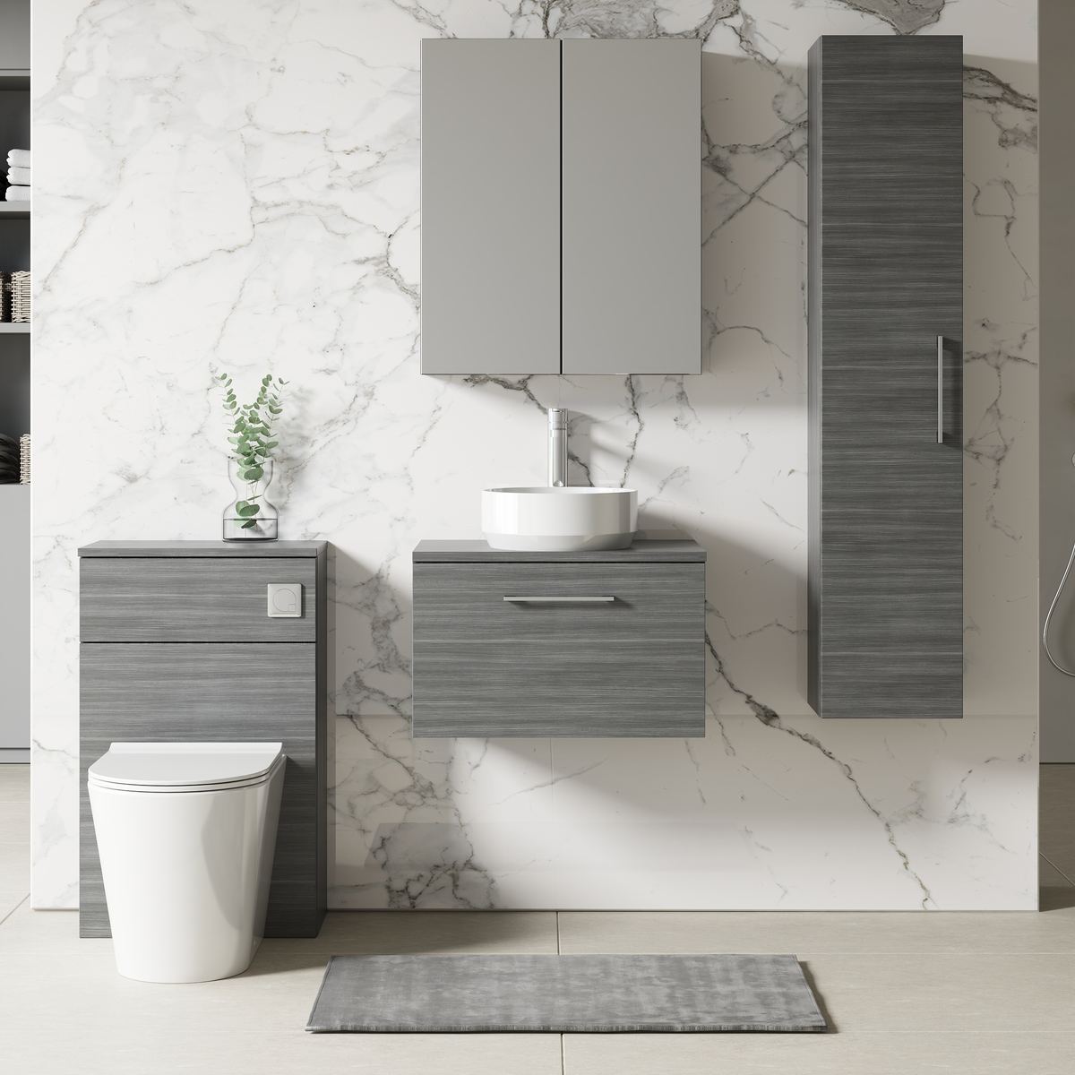 This unique anthracite finish compliments any modern bathroom and creates a designer look. This wall hung unit creates more space in your bathroom giving the illusion of a bigger bathroom. This unit has a soft close drawer which limits the daily wear and tear and provides a quieter closing action. Colour co-ordinate your unit with an anthracite WC unit. Supplied with worktop.