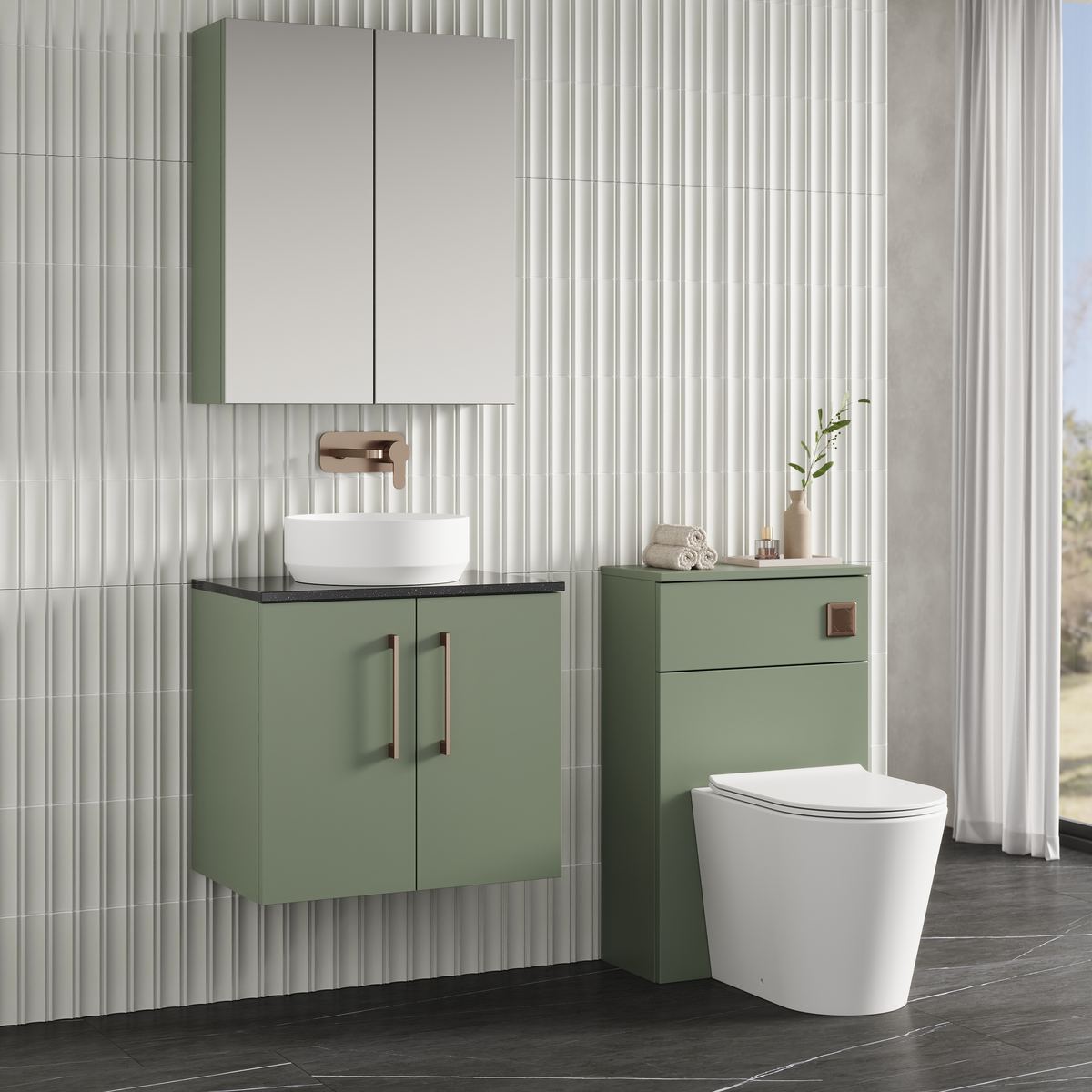 This unique green finish compliments any modern bathroom and creates a designer look. This wall hung unit creates more space in your bathroom giving the illusion of a bigger bathroom. This unit has a soft close door which limits the daily wear and tear and provides a quieter closing action. Colour co-ordinate your unit with a green WC unit. Supplied with laminate worktop, for use with vessel basins (sold separately).