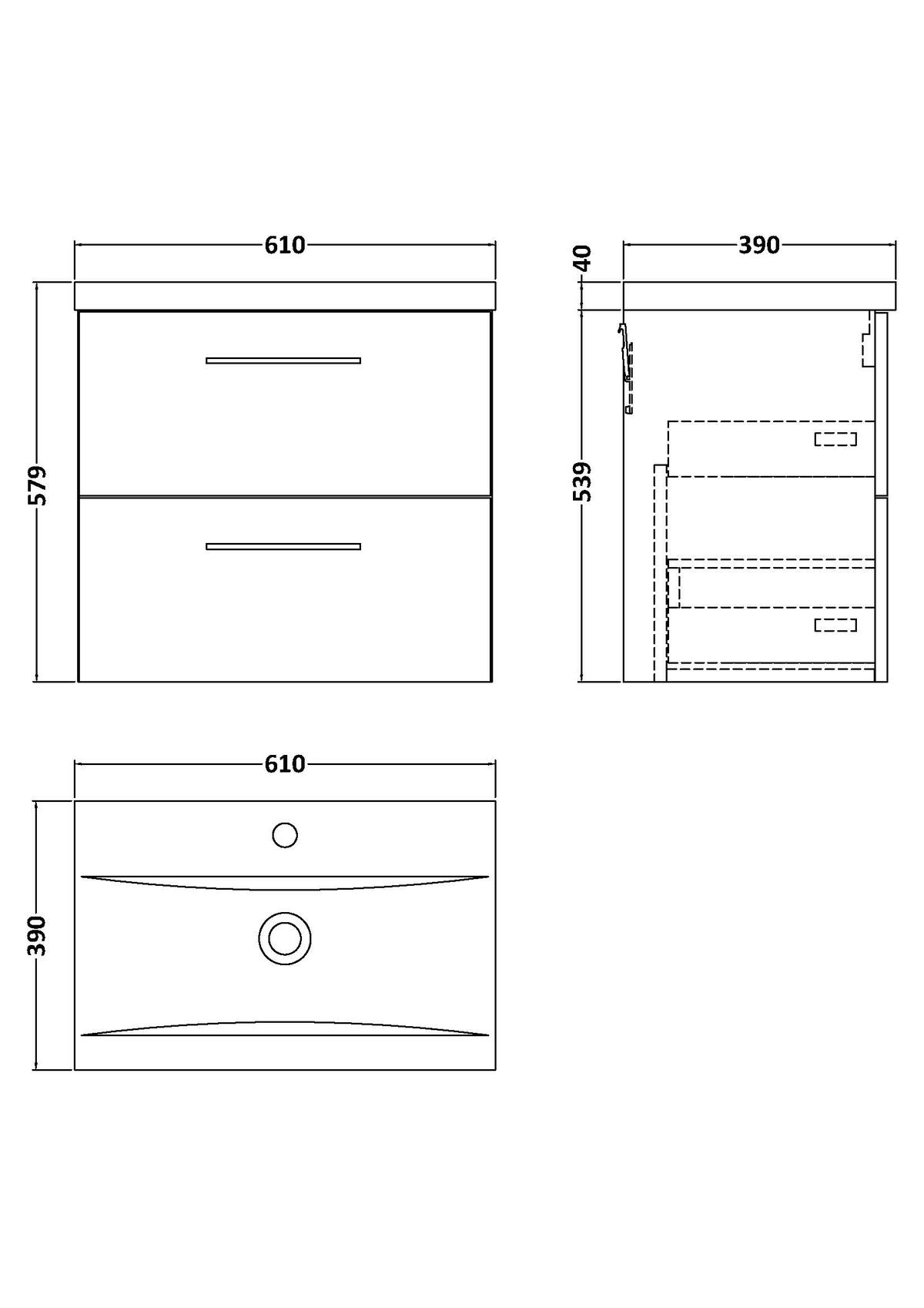 600mm Wall Hung 2 Drawer Vanity & Basin 1