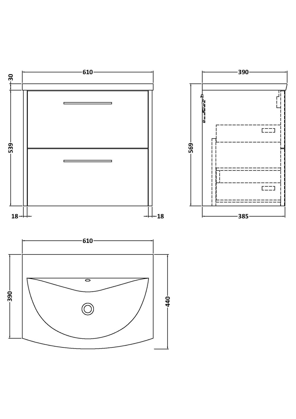 600mm Wall Hung 2-Drawer Vanity & Basin 4