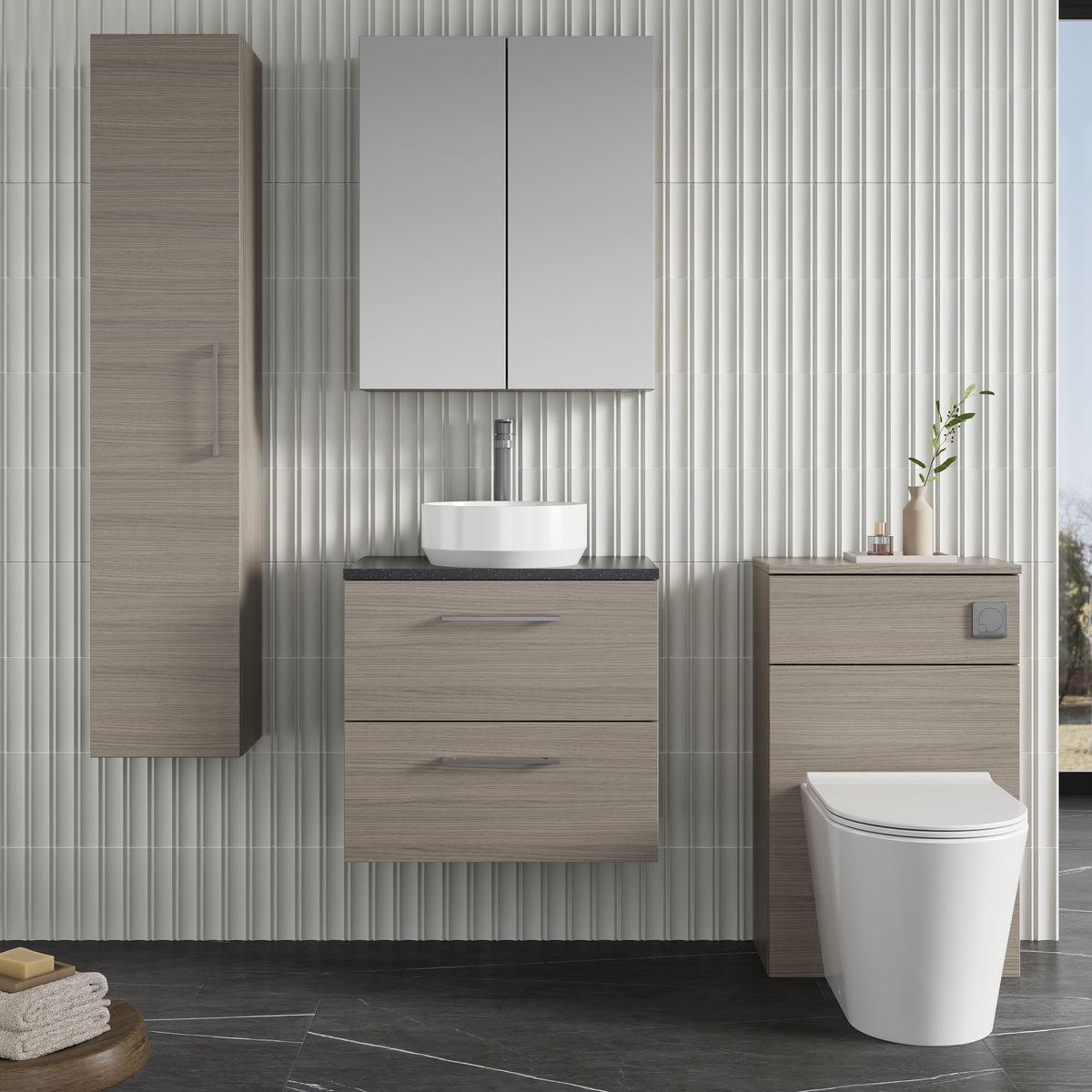 This unique solace oak finish compliments any modern bathroom and creates a designer look. This wall hung unit creates more space in your bathroom giving the illusion of a bigger bathroom. This unit has soft close drawers which limits the daily wear and tear and provides a quieter closing action. Colour co-ordinate your unit with a solace oak WC unit. Supplied with laminate worktop, for use with vessel basins (sold separately).