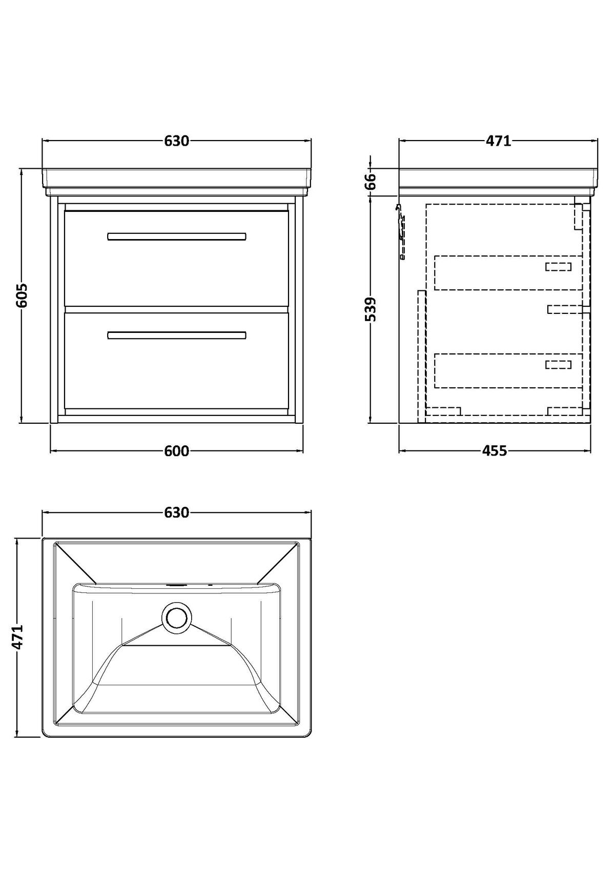 600mm Wall Hung 2-Drawer Vanity with Basin – 0 Tap Hole