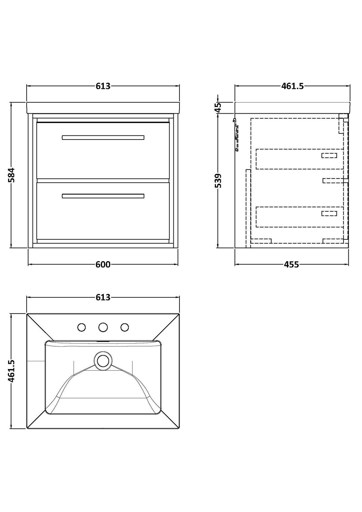 600mm Wall Hung 2-Drawer Vanity with Basin – 3 Tap Hole