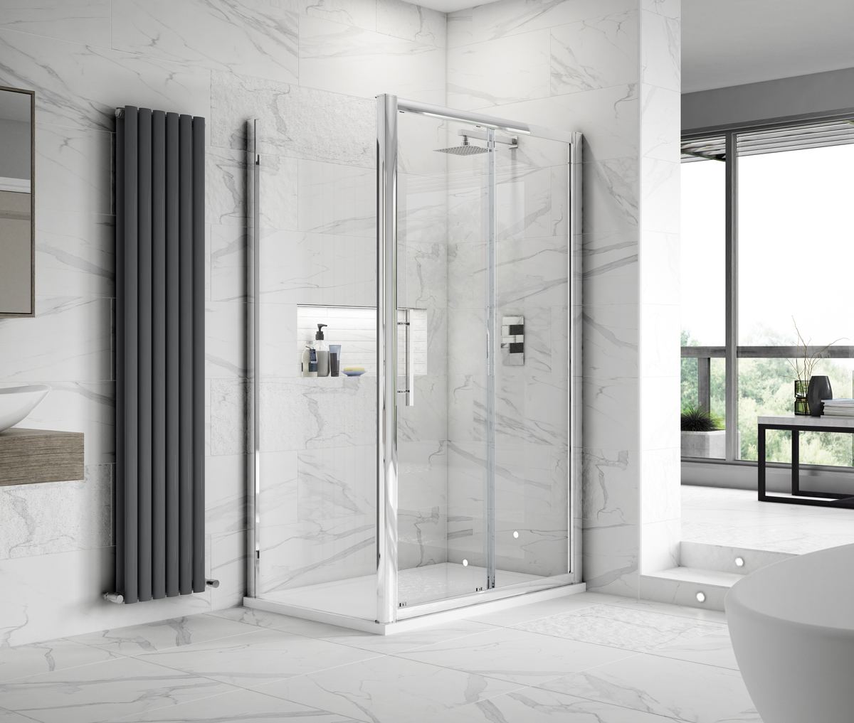 8mm toughened safety glass. Hidden Fixings. Patented Easyfit profile assembly system. Quick release bottom rollers for easy cleaning. Chrome magnetic door strips. Out of true wall adjustment 40. Smooth gliding doors. Shower Shield easy clean coating. Suitable for use with side panels or within a recess. Minimalist T-bar handle. All enclosures are back by a lifetime guarantee.