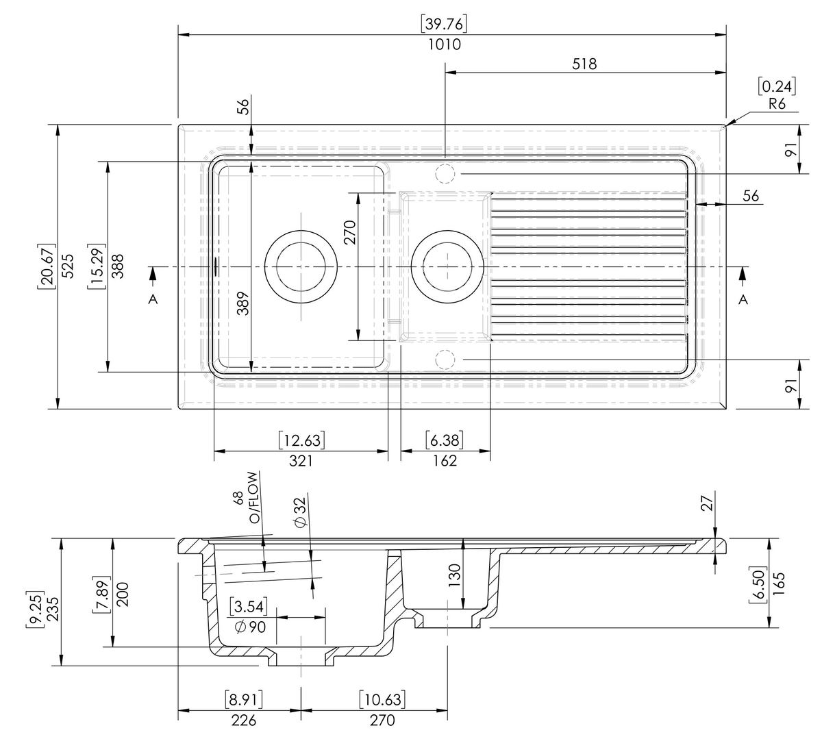 Counter Top Sink 1.5 Bowl 1010×525