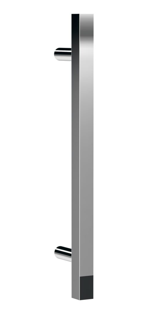 Square chrome handle for use with Pacific shower doors and enclosures.